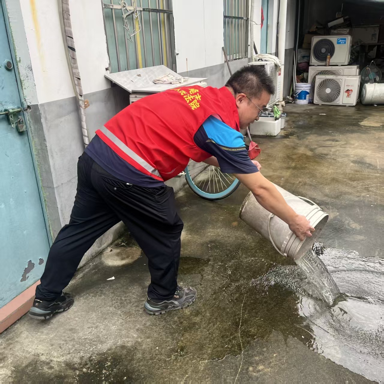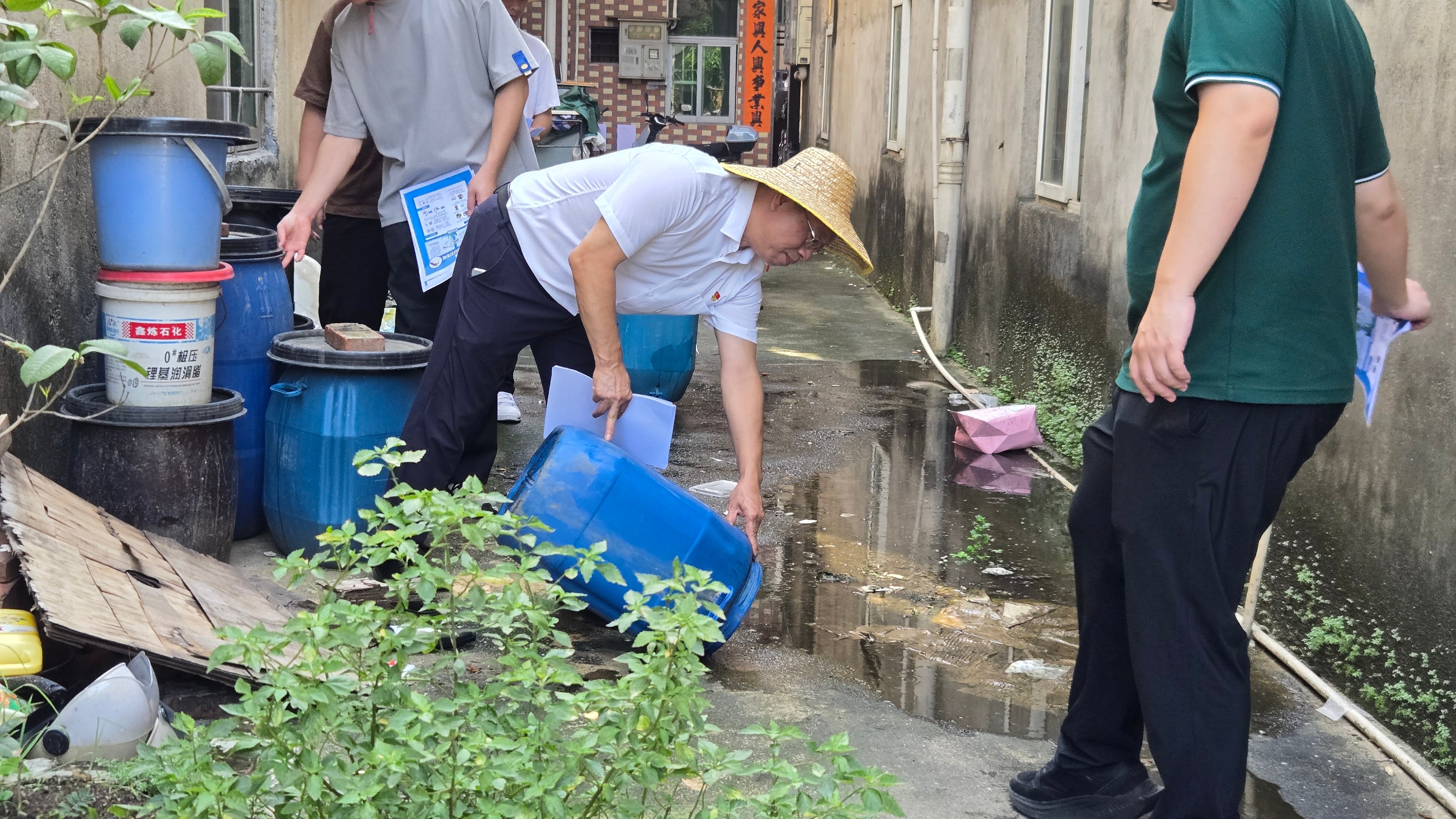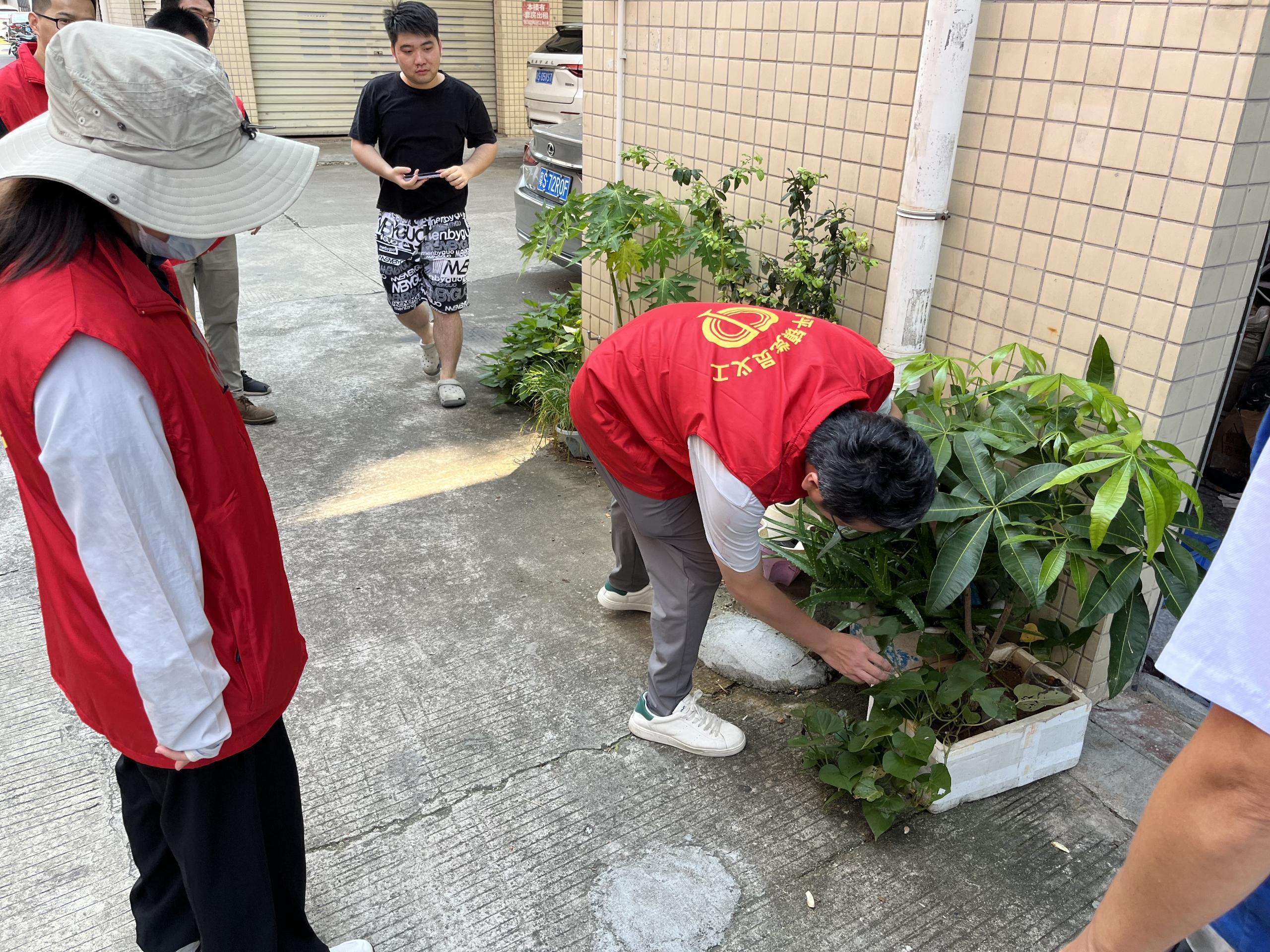 “阿叔,你家空箱空盆积水啦,蚊子会在水中下卵,要把积水倒在路边了。”